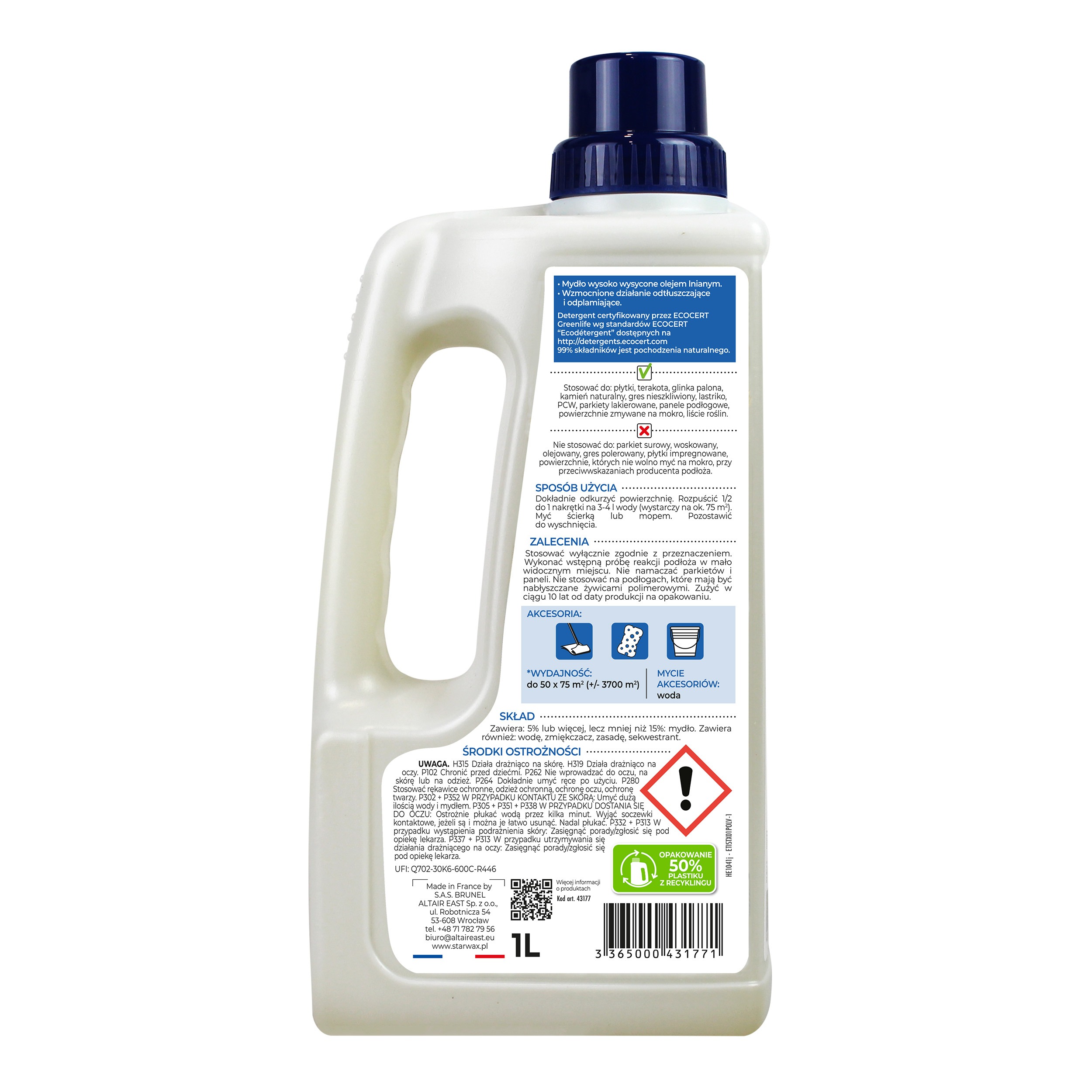 Regularne stosowanie mydła ma również działanie impregnujące, szczególnie w przypadku porowatych powierzchni, co pomaga zabezpieczyć je przed szkodliwymi czynnikami zewnętrznymi i przedłuża ich trwałość. Produkt jest szczególnie polecany do czyszczenia podłóg kamiennych, marmurowych, trawertynowych, a także lakierowanego parkietu, płytek, terakoty, gresu i wykładzin winylowych.